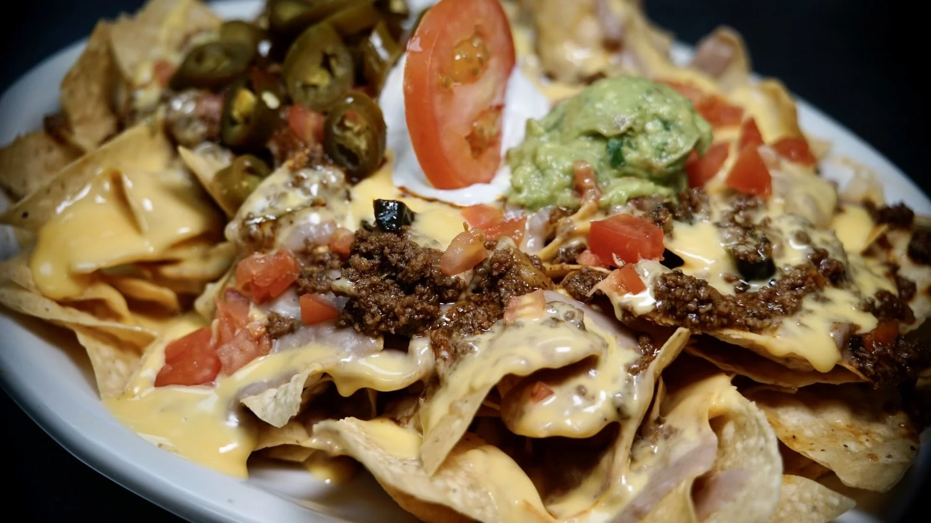 ground beef or shredded chicken, beans, chile con queso, sour cream, guacamole, and jalapeños.